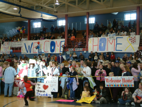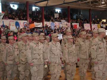 The 81 sun-tanned soldiers from the Westbrook armory of the 133rd Engineer Battalion stood at attention in the gymnasium of Westbrook High School dressed in their desert fatigues. They faced the podium and the wall. To their backs the gymnasium was crowded with families and friends holding signs and waiting in nervous anticipation.