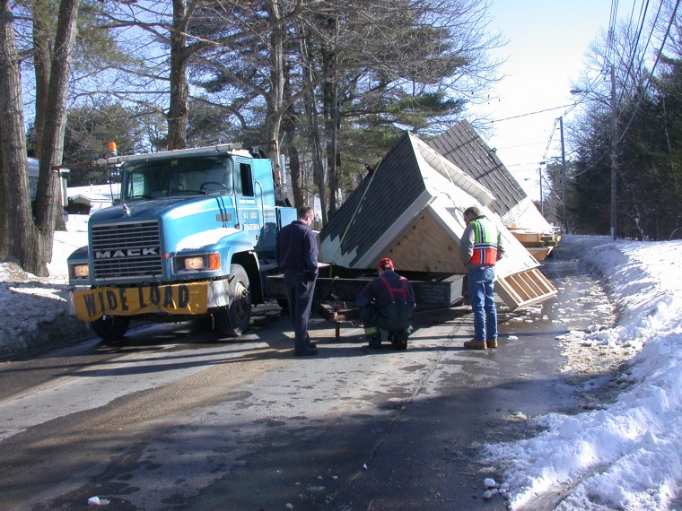 No one was hurt after a trailer carrying parts of a pre-fabricated house broke away from the truck towing it on Gorham Road March 10.