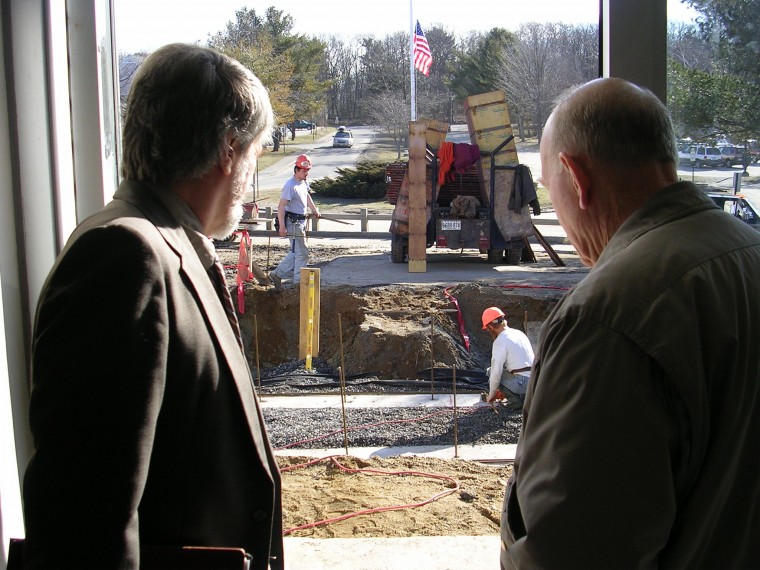 Interim Superintendent Robert Lyman, left, and School Board member Henry Adams look out the front entrance of Cape Elizabeth High School at work being done to the area.