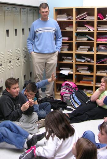 After gym class Mr. Wellman gathers the students in a circle around the small sitting area. He stands above them with a short-cropped haircut, boyish face and hands in his pockets.