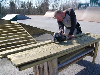 Windham police officer Matthew Cyr contracted skater and carpenter Josh Benson of Gorham to do the needed repairs. Benson, who helped build the Windham Skate Park back in 1999, is now hard at work constructing three new ramps that he says will be a little more advanced than the old ones.