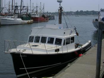 The RV Galatea sits at a dock at the Gulf of Maine Research Center.