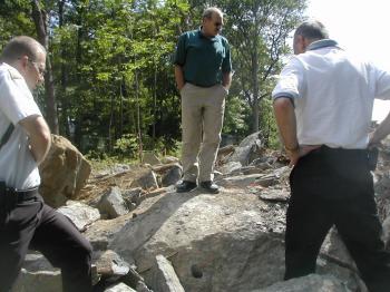 Fire Inspector Lt. Chuck Jarrett (left), Code Enforcement Officer Rick Gouzie (center) and Fire Chief Gary Littlefield look at a potentially live explosive charge embedded in a rock on Thursday, The charge was later determined to have been expended.