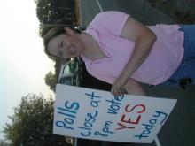 Former Gorham dispatcher Trixi Morin holds up a sign Monday urging residents to vote yes in the referendum to overturn the Town Council’s decision to merge its dispatching services with the county’s