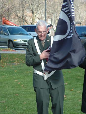 Vets Ray 1 Ray Rietze of Westbrook listens to the national anthem at Westbrook’s Veterans Day ceremony in Riverbank Park Thursday. Rietze, a World War II veteran, carried a flag honoring prisioners of war and those who are still missing in action.