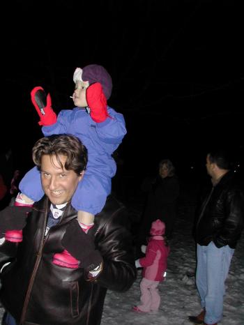 (tree lighting 1) – Alden Dimick, 1 1/2, sitting on the shoulders of his dad, Scott Dimick, applauds the Gorham High School Chamber Singers at the tree lighting ceremony on Sunday in Gorham.