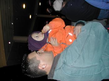 Mark Damon of Westbrook holds his son Bronson as they listen to Christmas carols at the tree lighting on Sunday.