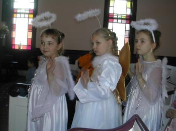 Three angels in the Christmas pageant on Sunday at North Congregational Church are, left to right, Arielle Peterson, Alexis Jongerden and Abby Ward.