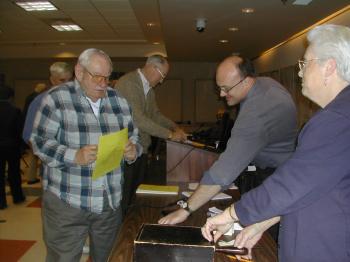 (Roland Tapley) – Buxton resident Roland Tapley votes in a special town meeting on Wednesday while Town Clerk John Myers and Registrar of Voters Joan Weeman attend the ballot box.