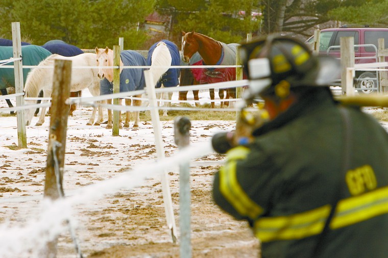 (News Perkins Fire 7788) – Horses displaced by Tuesday’s barn fire at Perkins Farm on County Road warily eye the mopping up operation as Ross Larrabee of the Gorham Fire Department wets down the smoldering embers.
