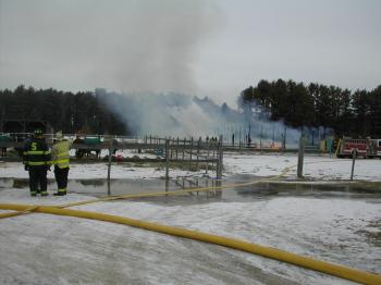 Firefighters pumped water onto the fire from tankers and the water supply was augmented from a pond on the opposite side of County Road. Both travel lanes of the road were closed to traffic. “It was really going there for awhile,” said neighbor Connie Shiers. “Flames were way above the trees.”