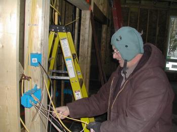 The Bar Mills Community Church is getting wired and hopes to celebrate Easter in a new building. Electrician Mike Murphy of Mancini Electric, Inc., is working in the new church building on Monday.