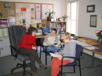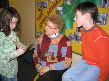 (Mrs. Knight jpg) – Caleb Porter and Travis Harmon interviewing Heather Knight, Jewett-Hanson School Principal. “I think we should turn off lights, especially when not in use.” Was Mrs. Knight’s recommendation for energy conservation.
