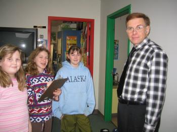 (Mr. Hawkes jpg) – Laren Sharples, Samantha Cox, and Marley Harmon, interviewing Rick Hawkes, fourth grade teacher at Frank Jewett. “What do you recommend (concerning energy conservation), Mr. Hawkes?””Do it now!” responded Mr. Hawkes.