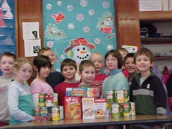 Cutline (Jack Memorial in Buxton) – Third grade students organizing the food collected at school for the food pantry are, left to right in the front row, Taylor Alcorn, Caitlyn Paquette, Joshua Baldridge, Josh Grant, Cheyenne Rae, and Dale Gammon. Back row, Alex Deering, Wiley Hollen, Trevor Puckett, Sarah Gilpatric, and Justin Bryant.