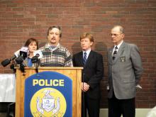 Raymond resident Dana Desjardins, whose 10-year-old son was assaulted by a water delivery driver last summer, addressed the crowd at a press conference Friday at the Portland Police Department. He asked for support of LD 1717, Jessicatime offenders convicted of gross sexual assault against victims under 12. The House this week effectively killed the proposal. Behind Desjardins from left are Rep. Kimberly Davis (R-Augusta), Sen. Bill Diamond (D-Windham) and Sen. Dean Clukey (R-Aroostook County).