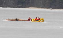 Rescuers come to the aid of two men who went through the ice on Sunday afternoon in the Lower Bay of Sebago Lake.