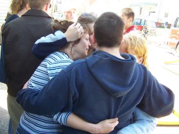 Lori Brogan is held by friends while she watches the remains of her apartment building at 195 Brown Street smolder under the hoses of fire fighters on April 26.