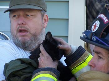 Dean Hamlin holds his cat, fur covered in glass and mouth black from smoke inhalation, after the April 26 fire that destroyed his building at 195 Brown Street. The cat was rescued by Westbrook fire fighters.