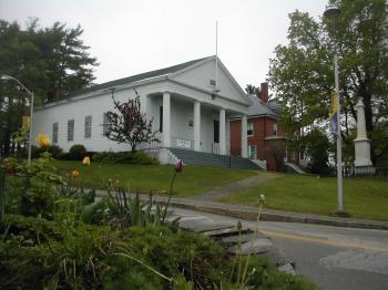 The former Gorham Town Hall on College Avenue was a gift from the town to the University of Southern Maine in 1961. The town acquired the building in a trade with Toppan Robie in the 1800s. It had been built in 1821 as a church and now houses the university’s art gallery. Robie gave the Civil War memorial, on the right, to Gorham in 1866. An inscription on the monument says, ” To the memory of the sons of Gorham who sacrificed their lives for their country in the great rebellion of 1861.