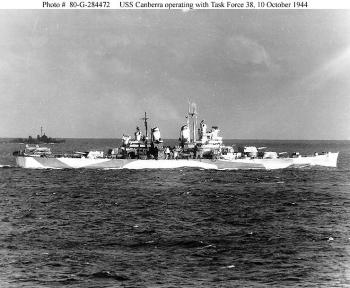 Leo Couture was a crewmember of the Uss Canberra pictured here on Oct. 10, 1944, three days before it was torpedoed by a Japanese pilot.