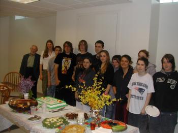 The teens joined residents for hors d’oeuvres, punch and a cake in the community room. “It’s an intergenerational party,” said Evelyn Orman, the wife of Cliff Orman, president of the Presumpscot Commons residents’ council.