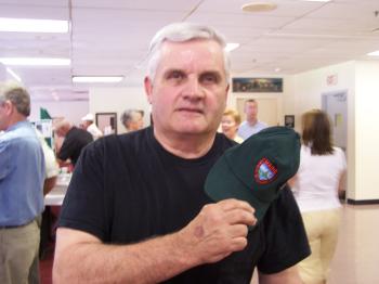 Sharon Elwell holds up the hat each permit winner receives from the Maine Department of Inland Fisheries and Wildlife.Twelve-year-old Dakota Bartlett and his stepfather Larry Butera can’t wait to hunt moose on Bartlett’s first permit.