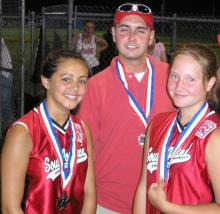 South Portland players Hayli Mulkern, left, and Julia Leighton with coach Jason Edwards after receiving their medals as runners-up in the District 6 12-year-old softball tournament.