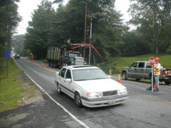 The road is open but at least one of its two lanes is closed to traffic. Durgin said both lanes could be closed at various times for removal of large trees. He said motorists could travel Huston Road to avoid being stuck in traffic.