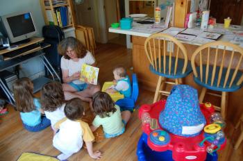 Family child care provider Elaine Gerardin, who operates My Daycare out of her home on Saco Street in Westbrook, reads to six children in the early afternoon before nap time. Gerardin will be resorting to sprinklers this year after the state placed emergency restrictions on pool use in child care homes and centers. Gerardin said she thinks the state “reacted with its guts, and not its brains.”