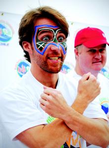 Tim “Eater X” Janus celebrates his win at the burrito eating contest at Costa Vida in South Portland last Saturday.