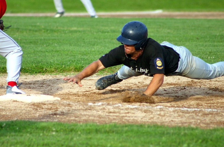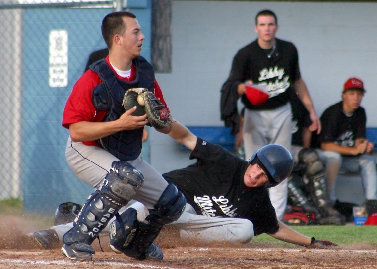 Libby-Mitchell’s Kevin Moskevich slides safely across home plate as Stockhouse catcher Tayler Clouatre gets the throw too late.