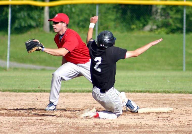 Libby-Mitchell’s Joe Cronin successfully steals second base as Stockhouse shortstop Matt Foye waits for the throw.
