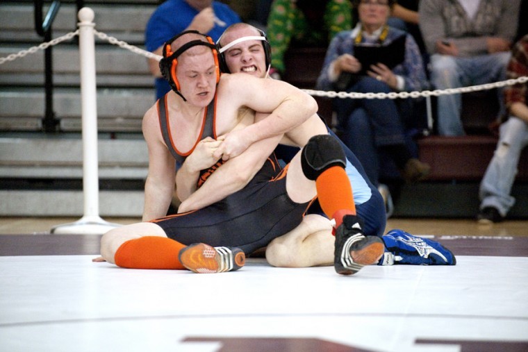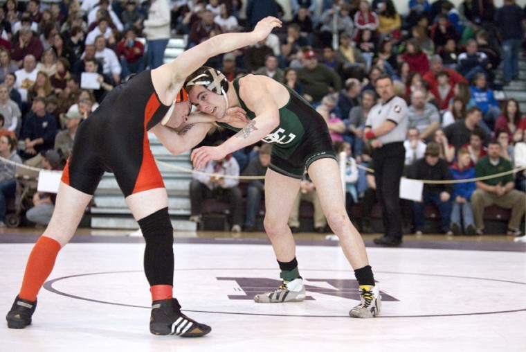 Bonny Eagle’s Joe Layte holds down Jacob Farrell of Deering on Saturday at the state championships at Noble High School. Layte won his opening match, but lost in the next round to Joey Buzzell of Skowhegan. Staff photo by Brandon McKenney