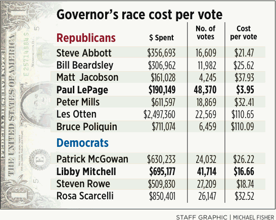 LePage’s campaign spent about $190,000, according to preliminary finance reports, to win the Republican gubernatorial nomination with 48,370 votes. That works out to less than $4 per vote.