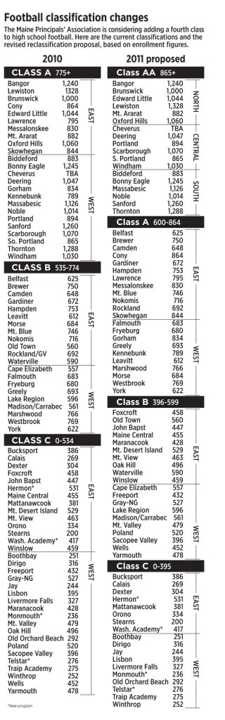 Western Class A would include such schools as Gorham, Kennebunk, Marshwood, Westbrook, Falmouth, Greely and York. The new Class A enrollment would range from 600 to 864.