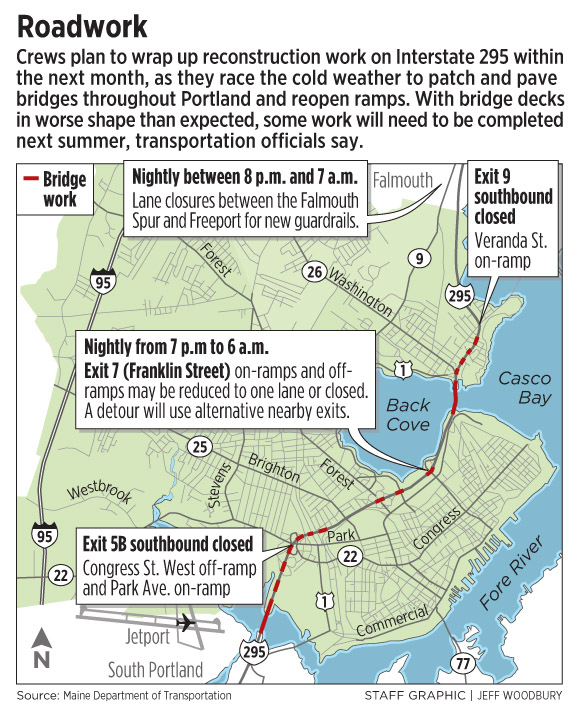 Three southbound ramps in Portland — at Veranda Street, Congress Street West and Park Avenue — continue to need work that’s keeping them closed.