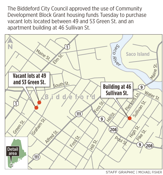 Community Development Block Grant funding in the amount of $186,000 will be given to the Biddeford Housing Authority to purchase vacant lots between 49 and 53 Green St. and a three-unit apartment building at 46 Sullivan St.
