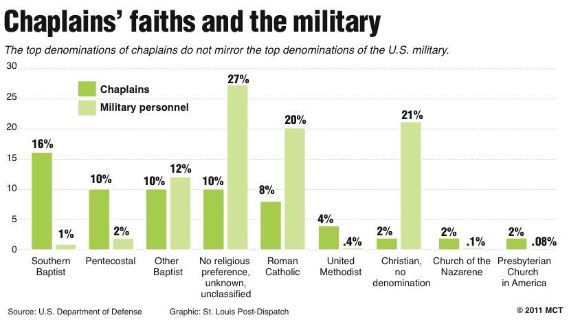 While just 3 percent of the military’s enlisted personnel and officers call themselves Southern Baptist, Pentecostal or a member of a denomination that’s part of the National Association of Evangelicals, 33 percent of chaplains in the military are members of one of those groups, according to Pentagon statistics.