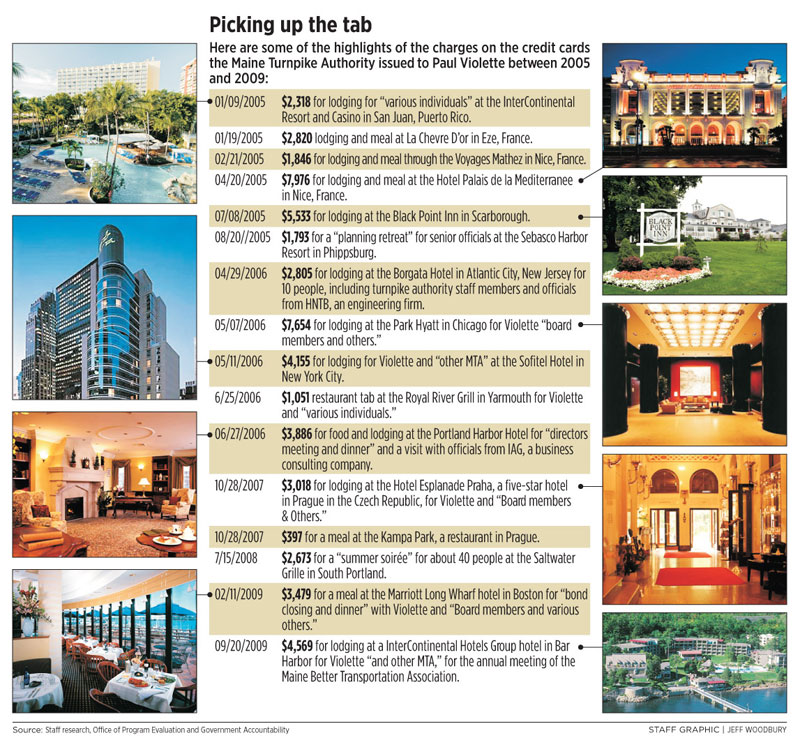 Violette’s credit card statements were obtained by the Office of Program Evaluation and Government Accountability last year as it reviewed the turnpike authority’s operations. The Legislature authorized the review because, since 1997, the turnpike authority has not transferred any surplus funds to the Maine Department of Transportation, as required by law.