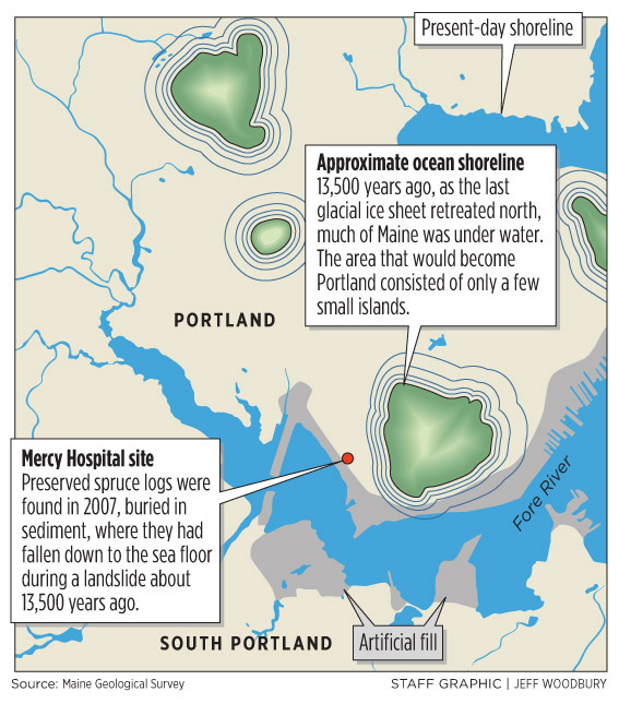 Researchers believe Portland consisted of a handful of islands 13,500 years ago, including Bramhall Hill, where Maine Medical Center is located.