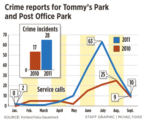 The number of crimes in the parks during that period increased from 17 in 2010 to 28 in 2011. The crimes included theft, assault, trespassing, harassment, indecent exposure and drug possession.
