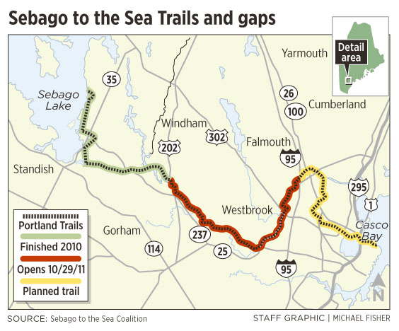 The first eight miles of the trail, starting at Sebago Lake in Standish, opened a year ago. The final six-mile stretch, from the turnpike to Portland’s East End Beach, is scheduled to open next fall.