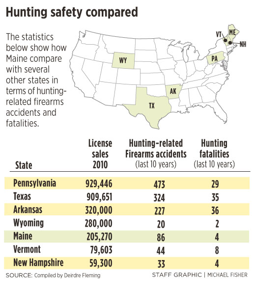 Of nine states that issue large numbers of deer and other big game hunting licenses and had data available last week, Maine had among the fewest fatalities from 2001 to 2010, with four. Arkansas recorded 36 hunting fatalities during the period, Texas had 35, Pennsylvania, 29; Idaho and Vermont, 8 each; New Hampshire, 4; Wyoming, 2; Nevada 0.