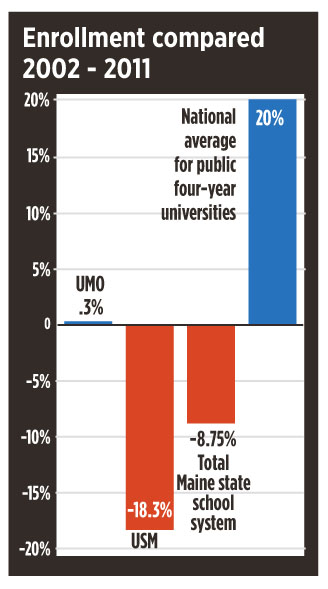 The Noel-Levitz study compared the two systems’ market shares of college-bound Maine high school graduates. The state universities consistently enrolled a third of those students through 2008. That figure dropped to 29 percent by 2010.