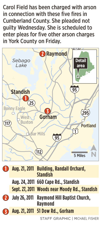 PORTLAND — Carol Field, the grandmother from Standish who is accused of being a serial arsonist, pleaded not guilty Wednesday to five charges stemming from fires in Cumberland County, including one that caused extensive damage to a church in Raymond last summer.