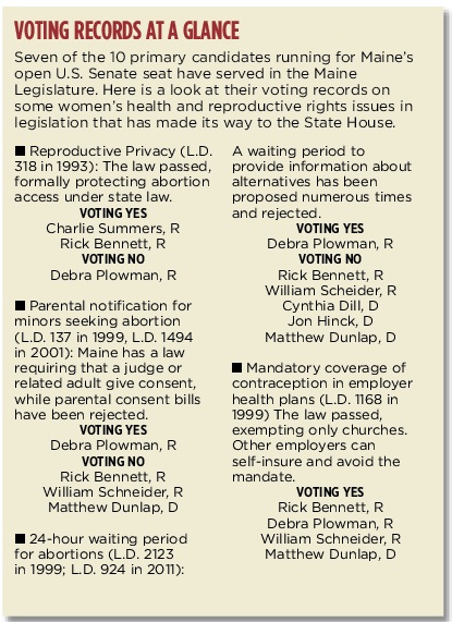 The Maine Sunday Telegram asked the 10 primary candidates and one leading independent running for Maine’s open U.S. Senate seat a series of questions about family planning, contraception and abortion. The Telegram also analyzed the voting records of the seven candidates who have served in Maine’s Legislature.