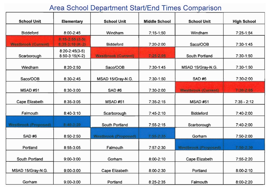 Westbrook’s start times are now among the earliest in the area. They will be among the later ones if the proposed changes are made, according to a spreadsheet provided by the Westbrook School Department.