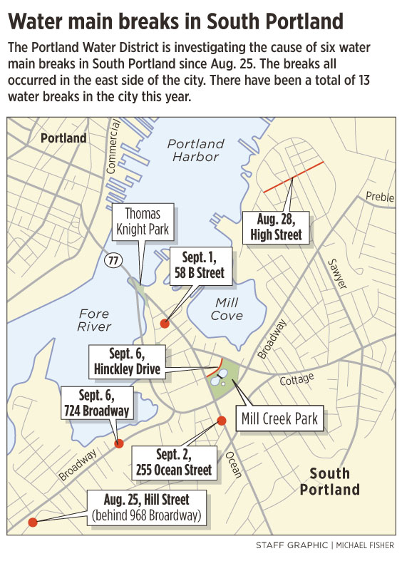 The six breaks since Aug. 25 — nearly half of the 13 water main breaks in South Portland this year — all have occurred in the east side of the city, on Broadway, Hinckley Drive, and Hill, Ocean, High and B streets.