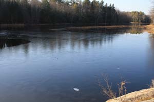 A thin sheet of ice covers Runaround Pond in Durham last week.